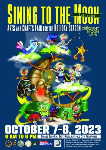 In line with the celebration of NATIONAL MUSEUM and GALLERY MONTH, Crescent Moon Café presents SINING TO THE MOON (HAVE LANDED!) in joyful support of the City Government of Antipolo, AnCCATPO, NCCA & DILG, continuing the spirit of art appreciation becoming art practice. Emerging Antipolo Artists will display their works to ignite an early Christmas Bazaar in the city.